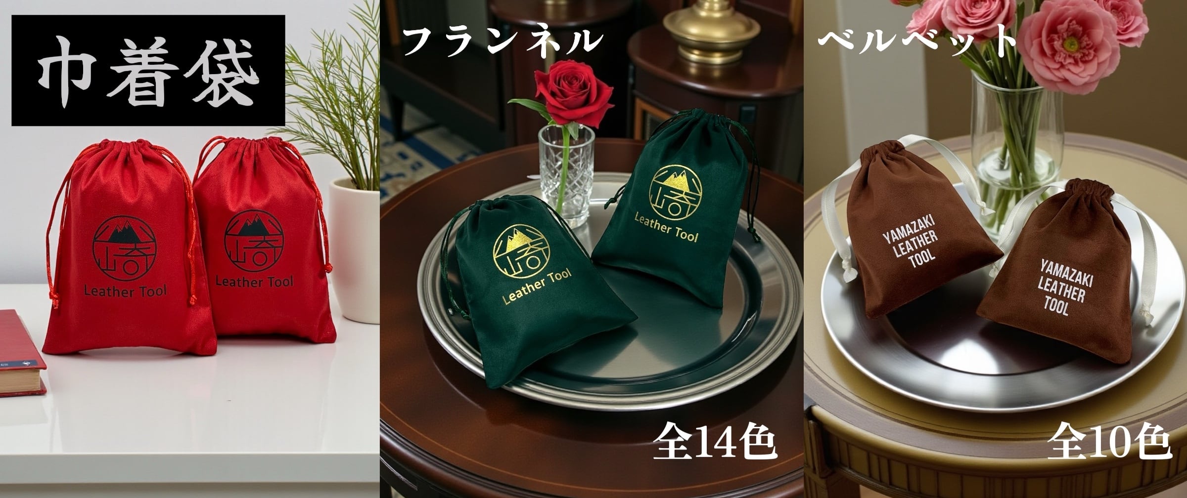 当店では、主にオーダーメイドの刻印(金型)と、焼印・箔押し・型押しなどにご使用いただける専用工具、そしてロゴ入れが可能な巾着袋を取り扱っております♪