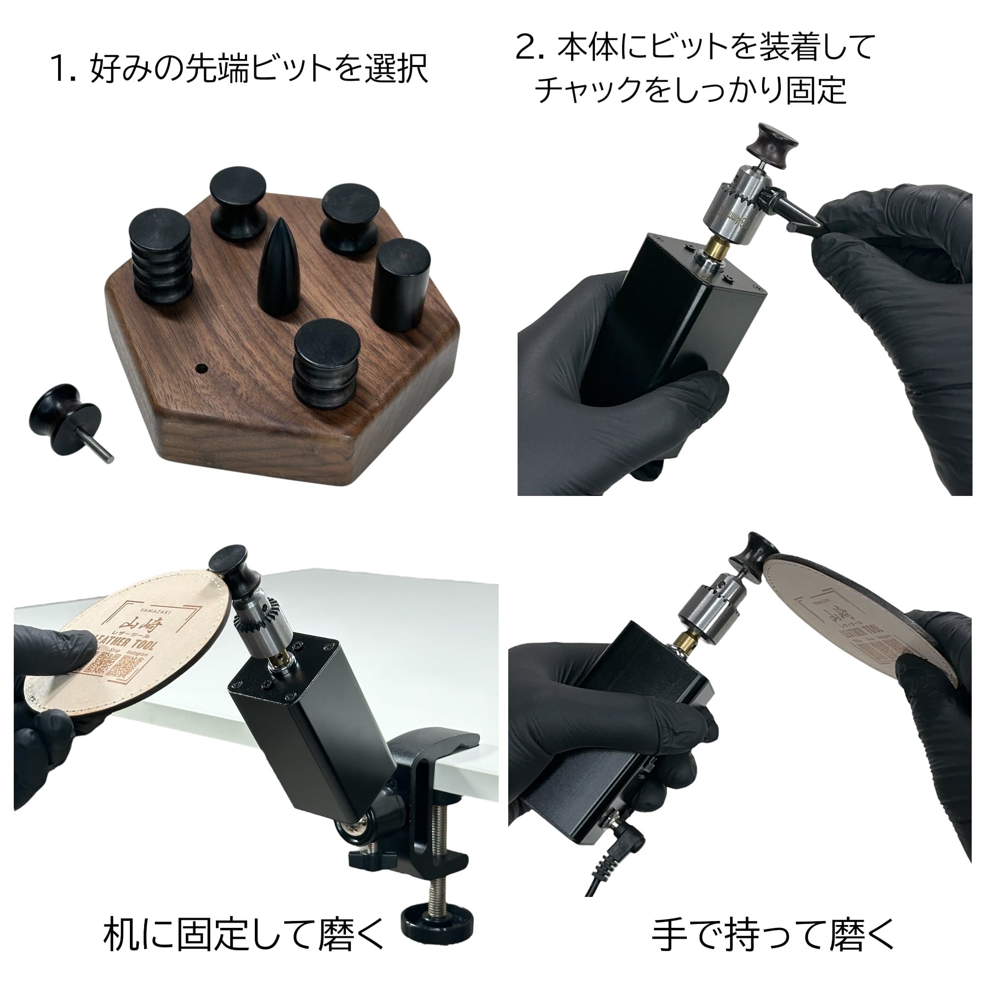 電動コバ磨き機 Vulcan レザーバーニッシャー本体+先端ビット7点セット付き(革のコバ磨き用)