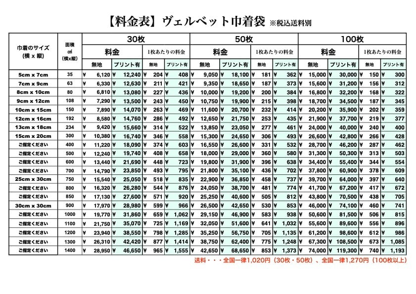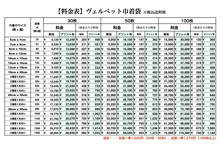 本文 :①ご希望の巾着サイズ・数量