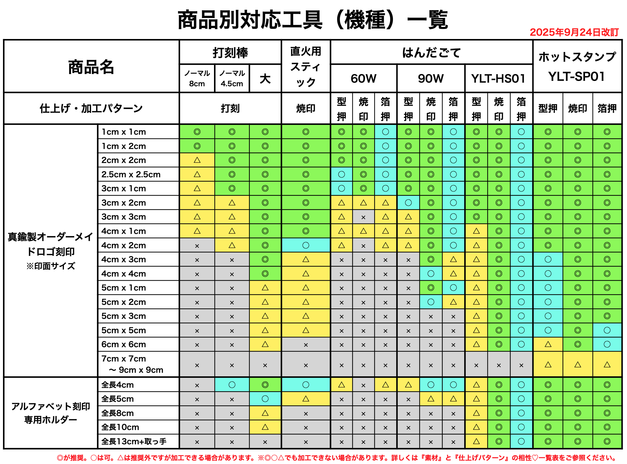 ご使用頂く際の、推奨刻印サイズにつきましては、別表の『商品別対応工具(機種)一覧』をご参照ください。