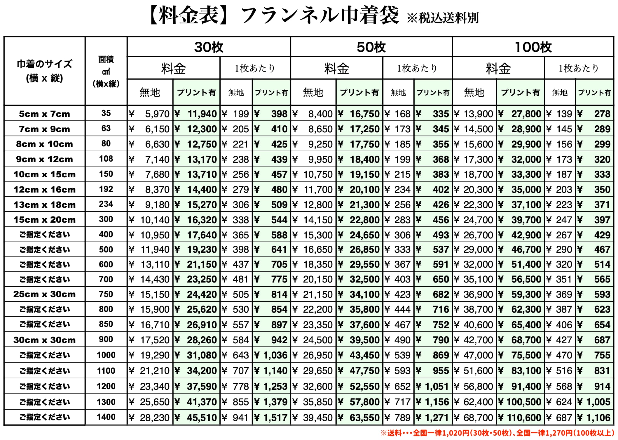 *巾着サイズ(縦x横の面積)が400㎠を超える場合、ご希望の寸法(縦x横寸法)を備考欄へご記入ください。