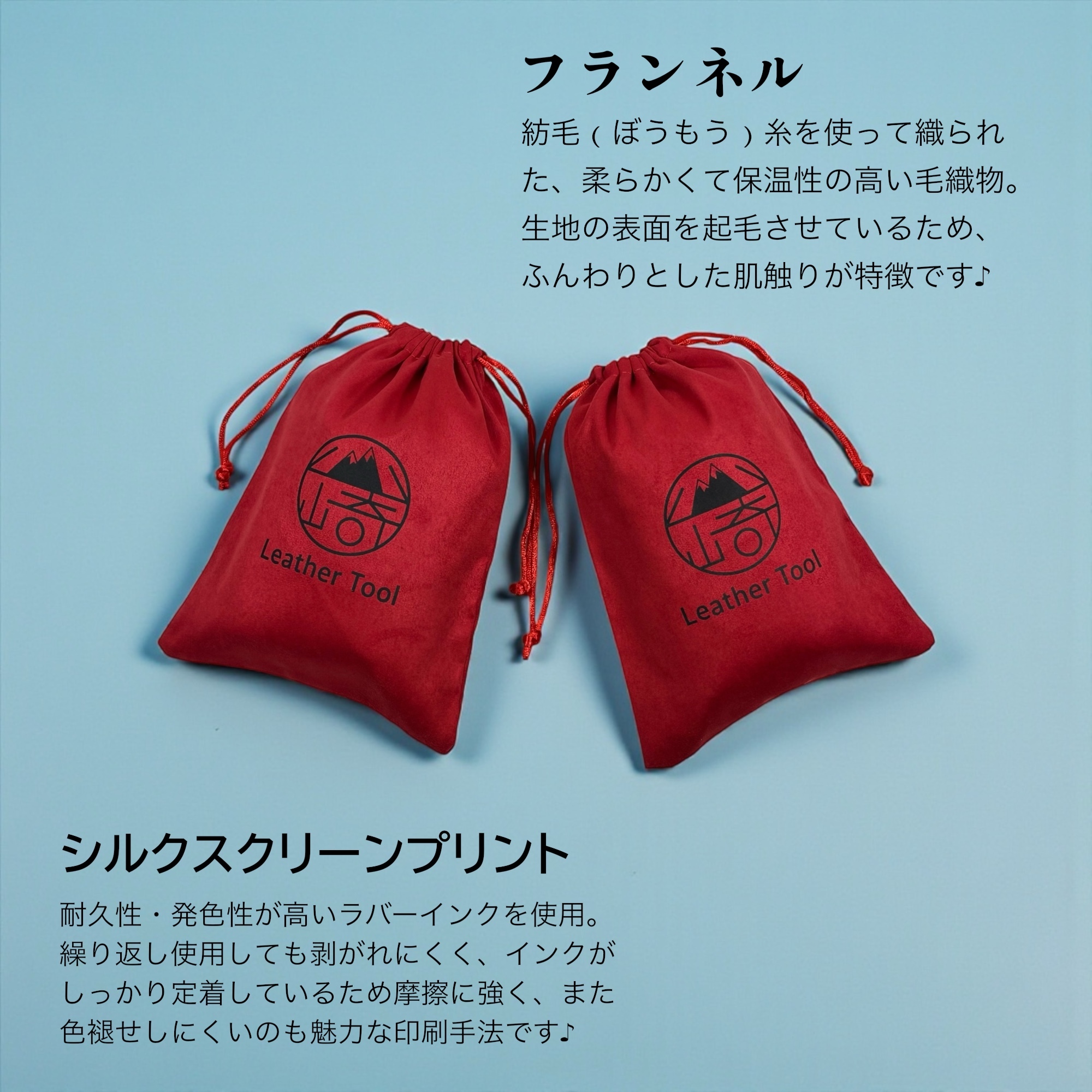 高級感があり、ふんわりとした優しい手触りのフランネル生地を用いて、巾着袋を製作いたします。