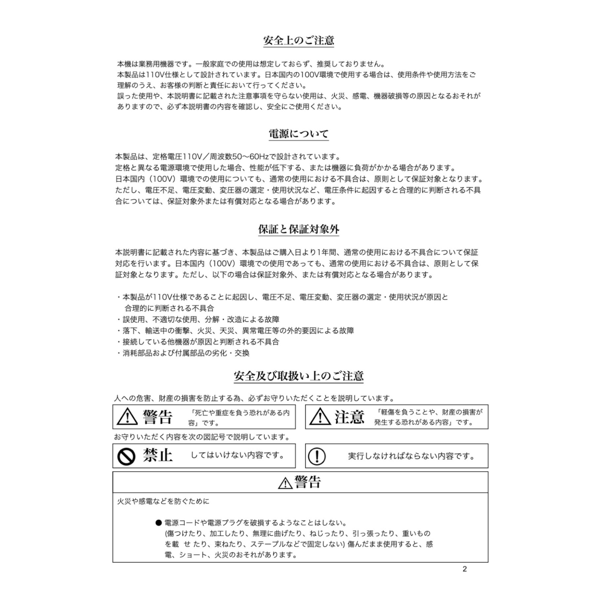 本製品は110V仕様の業務用機器ですが、日本国内(100V)環境での使用についても、通常の使用における不具合は、原則としてご購入日より1年間保証対応を行っております。