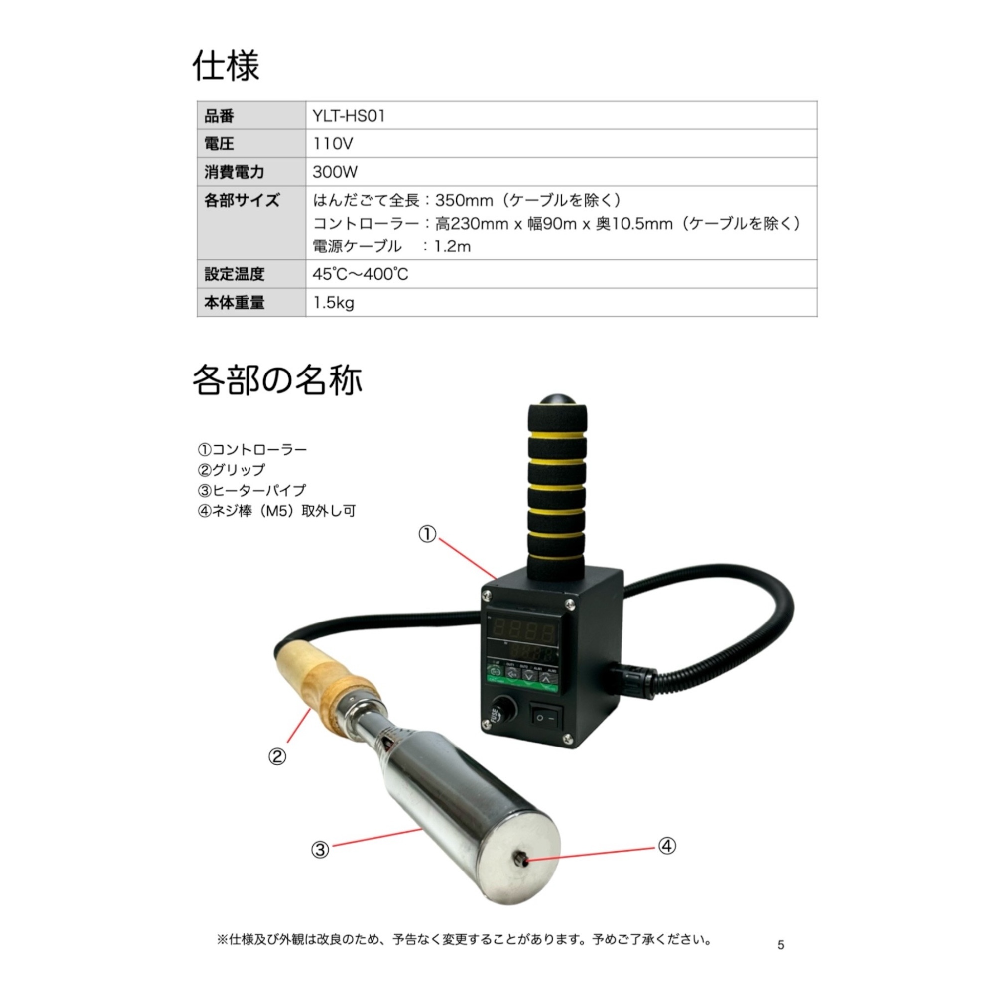 本製品「YLT-HS01」は、温度調節機能を備えた業務用はんだごてです。